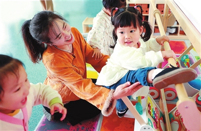 在長島實(shí)驗(yàn)幼兒園,教師悉心陪護(hù)孩子們玩耍。