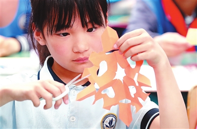 課后服務(wù)時間,長島第一實(shí)驗(yàn)學(xué)校學(xué)生學(xué)習(xí)剪紙。