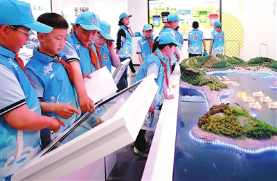 在長島海洋生態(tài)文明展覽館,長島第一實(shí)驗(yàn)學(xué)校學(xué)生進(jìn)行研學(xué)實(shí)踐。