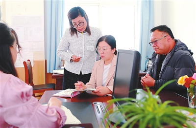 在長島北長山鄉(xiāng)中心小學(xué),來自煙臺市福山區(qū)的支教教師臧巧玉(右三)和當(dāng)?shù)亟處熃涣鹘虒W(xué)經(jīng)驗(yàn)。