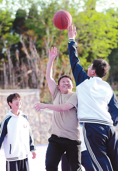 長島中學(xué)課外活動時間,來自山東省蓬萊第二中學(xué)的支教教師郭子軍和學(xué)生一起打籃球。