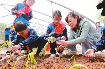 在長島第二實(shí)驗(yàn)學(xué)校舉辦的“海娃耕讀園”春季開耕節(jié)上,教師指導(dǎo)學(xué)生栽種向日葵。
