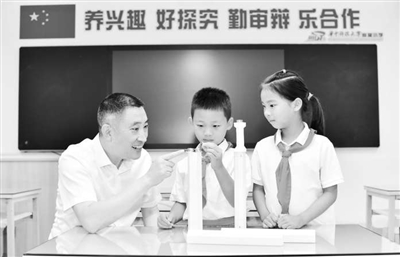 2024年,華中科技大學附屬小學朱映暉老師在實驗室里組織一年級學生開展“紙塔頂硬幣”挑戰(zhàn)賽。資料圖片