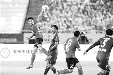 6月21日,常州隊(duì)球員盧志勇(左一)在“蘇超”第五輪對(duì)陣南京隊(duì)的比賽中。最終,常州隊(duì)主場(chǎng)0比4不敵南京隊(duì)。