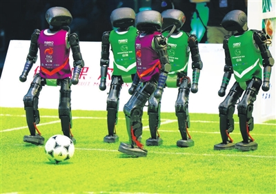 6月28日,中國首場機器人足球3V3 AI賽舉行,參賽機器人通過AI操控實現(xiàn)自主踢球。共有來自北京信息科技大學Blaze光熾隊、清華大學未來實驗室Power智能隊、清華大學火神隊、中國農(nóng)業(yè)大學山海隊的4支機器人隊伍角逐綠茵場。最終,清華大學火神隊以5∶3奪得冠軍,中國農(nóng)業(yè)大學山海隊獲得亞軍,清華大學未來實驗室Power智能隊與北京信息科技大學Blaze光熾隊并列獲得季軍。