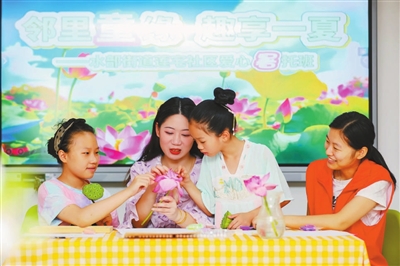 7月3日,福建省福州市鼓樓區(qū)水部街道蓮宅社區(qū)黨群服務(wù)中心,志愿者正在指導(dǎo)孩子識(shí)別荷花形態(tài)。 謝貴明 攝
