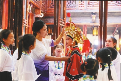 7月2日,浙江省湖州市德清縣乾元鎮(zhèn)開設(shè)“暑期學(xué)戲曲 童星展風(fēng)采”戲曲公益課堂,孩子在馬花堂文化空間體驗(yàn)戲曲妝。 倪立芳 章美麗 攝