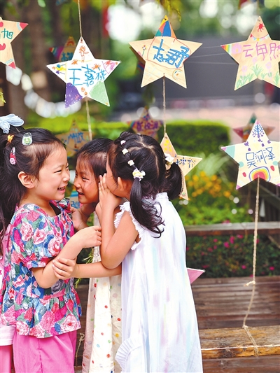 日前,中華女子學(xué)院附屬實(shí)驗(yàn)幼兒園舉行了主題為“最好的未來”的畢業(yè)典禮。活動(dòng)中,孩子、教師和家長們用音樂、舞蹈、視頻,致敬孩子、致敬家長、致敬教師和園長,飽含祝福和希冀。圖為孩子們?cè)谟H手繪制的星星簽名墻前互相擁抱、祝福。 鄭嵐吉 攝