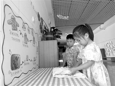 幼兒按照圖示自主疊衣服。幼兒園供圖
