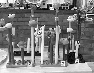 幼兒和教師共同制作的作品展示架。幼兒園供圖