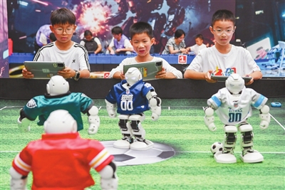 7月6日,浙江省金華市金華之光文化廣場(chǎng)科技館內(nèi),小朋友在體驗(yàn)足球機(jī)器人。當(dāng)日,金華之光文化廣場(chǎng)科技館舉辦AI智能機(jī)器人科普展,吸引了許多家長(zhǎng)帶著小朋友與人形機(jī)器人、智能機(jī)器狗、下棋機(jī)器人、足球機(jī)器人等互動(dòng),沉浸式感受人工智能技術(shù)的魅力,樂享暑期生活。