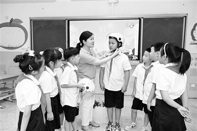 近日,江蘇省太倉市科教新城實驗小學教師指導學生正確佩戴安全頭盔。計海新 攝