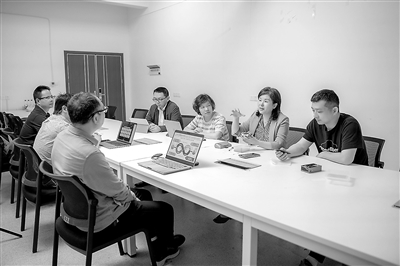 趙歡(右二)組織教學(xué)研討會。學(xué)校供圖