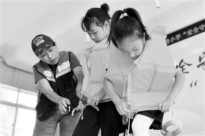 7月4日,在山東省青島市市北區(qū)宜陽路小學(xué)暑期休業(yè)式上,學(xué)生們在體驗正確穿戴救生衣。通訊員 王海濱 攝