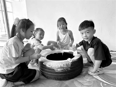 雄安容西望泉小學(xué)學(xué)生在上輪胎畫實(shí)踐課程。王東來 攝