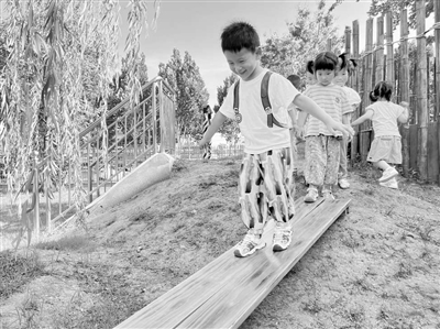 教研進(jìn)入第四周,隨著教師和家長(zhǎng)放心、放手,小班幼兒的膽量和運(yùn)動(dòng)能力飛速提升,戶外活動(dòng)場(chǎng)發(fā)生了奇妙變化。最明顯的是小山坡,以前幾乎看不到小班幼兒的身影,現(xiàn)在那里卻成了小班“冒險(xiǎn)家們”的樂(lè)園。明明攀登陡坡走不穩(wěn),多次嘗試失敗后竟手腳并用爬上了坡頂。他開(kāi)心地大喊:“老師,你看看我!”最靦腆的朵朵,也敢在壕溝之間的獨(dú)木橋上張開(kāi)雙臂保持平衡走來(lái)走去。