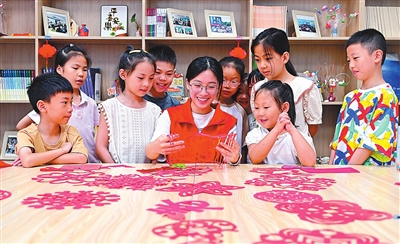 圖② 近日,在四川省眉山市仁壽縣新時(shí)代文明實(shí)踐中心,志愿者正在教孩子們剪紙。潘建勇 攝