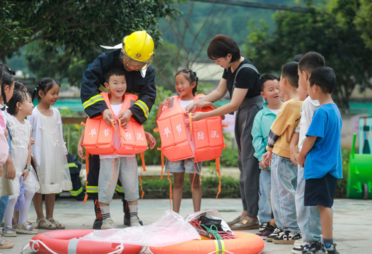 近日,在貴州省黔西市永燊彝族苗族鄉(xiāng)火石壩村,消防人員指導(dǎo)學(xué)生穿救生衣。周訓(xùn)超 攝
