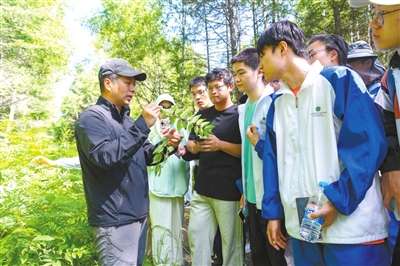 7月15日,在實(shí)習(xí)現(xiàn)場,東北林業(yè)大學(xué)林學(xué)院教授王秀偉(左一)教學(xué)生辨認(rèn)植物形態(tài)特征。