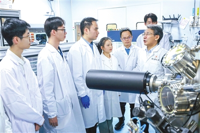 中國科學(xué)院院士、南方科技大學(xué)校長薛其坤(右一)和團(tuán)隊(duì)成員在實(shí)驗(yàn)室。