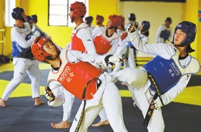 近日,在山東省棗莊市,孩子們?cè)诰毩?xí)跆拳道。 孫中喆 攝