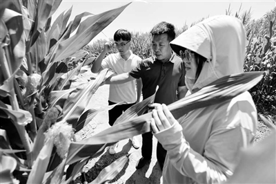 當(dāng)日,鑫源農(nóng)機農(nóng)民專業(yè)合作社理事長趙剛(中)向大學(xué)生們介紹玉米生長情況。