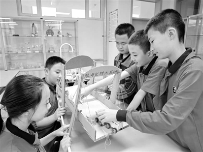 這樣的探究得益于學(xué)??茖W(xué)教育校本課程。該校目前已開(kāi)發(fā)了約270個(gè)課程內(nèi)容及教學(xué)資源,涉及物質(zhì)科學(xué)、生命科學(xué)、地球科學(xué)、工程設(shè)計(jì)、人工智能、太空科技6個(gè)主要領(lǐng)域?!拔覀兇_保小學(xué)到初中各年級(jí)學(xué)生,每學(xué)年至少參與60課時(shí)的科學(xué)探究實(shí)踐?!毙iL(zhǎng)周旭光介紹。