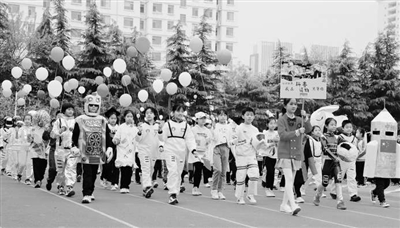 山東省臨沂樸園小學讀書節(jié)開幕式上,四年級“科普讀物”方隊入場。 學校供圖