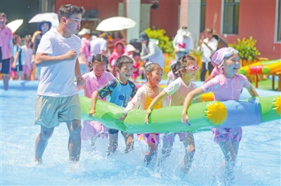日前,貴州省貴陽市開陽縣東山幼兒園開展了親子戲水活動(dòng),現(xiàn)場(chǎng)熱鬧非凡。家長(zhǎng)和孩子們參加七彩泡沫、水槍大戰(zhàn)等項(xiàng)目,在趣味游戲中享受清涼。圖為孩子們手持“闖關(guān)氣墊”向前沖刺。