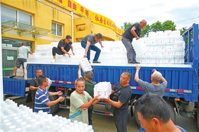 7月29日,在太師莊中學(xué)居民安置點,人們搬卸飲用水。