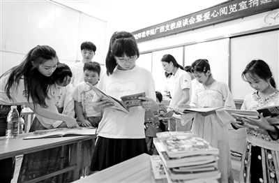 8月1日,地處大山深處的廣西興安縣高尚鎮(zhèn)中心校收到來自黃海之濱的鹽城師范學(xué)院師生捐贈的上千冊圖書。圖為高尚鎮(zhèn)中心校學(xué)生翻閱鹽城師范學(xué)院師生捐贈的圖書。