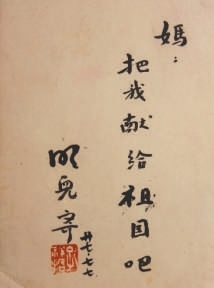 1938年6月,19歲的孔邁瞞過(guò)父母,為抗戰(zhàn)北上。途經(jīng)香港時(shí),他用即將到來(lái)的“七七事變”一周年紀(jì)念日作為落款時(shí)間,并以母親對(duì)自己的愛(ài)稱“明兒”署名,在一張7寸黑白相片背面寫下:“媽:把我獻(xiàn)給祖國(guó)吧。”他托人將相片轉(zhuǎn)交給尚在蘇門答臘島的父母。