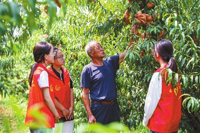8月13日,在河北省邯鄲市復(fù)興區(qū)戶村鎮(zhèn)大滋然生態(tài)農(nóng)業(yè)有限公司,返鄉(xiāng)大學(xué)生在聽取果農(nóng)講述鮮桃套袋技術(shù),在實(shí)踐中提升綜合素養(yǎng)、厚植鄉(xiāng)土情懷。 聶長(zhǎng)青 陳夢(mèng)千 攝