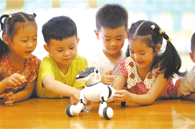 暑假期間,四川省樂(lè)山市金蘋果邦泰幼兒園托管班開(kāi)設(shè)人工智能課程活動(dòng),孩子們通過(guò)對(duì)話、握手、行走等互動(dòng)環(huán)節(jié),在趣味體驗(yàn)中樂(lè)享智能科技的魅力,豐富暑假生活。圖為孩子們?cè)谂c智能機(jī)器人互動(dòng)。李華時(shí) 郭琴 攝
