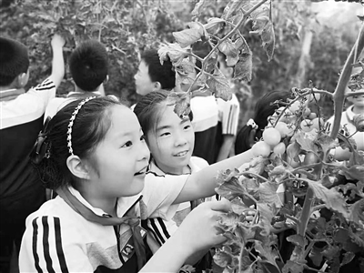 ①店子鎮(zhèn)第二小學的學生在西紅柿大棚進行研學。