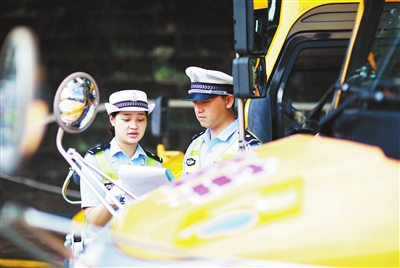 8月22日,貴州省赤水市公安局交通管理大隊(duì)民警對(duì)校車(chē)信息進(jìn)行核查登記。王長(zhǎng)育 攝