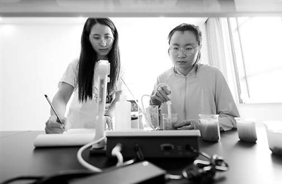 8月21日,陜西省定邊縣生態(tài)氣象聯(lián)合實(shí)驗(yàn)室里,張夢婕(右)在西北農(nóng)林大學(xué)博士生指導(dǎo)下進(jìn)行土壤理化特性測定。靳軍 本報(bào)記者 張學(xué)軍 攝