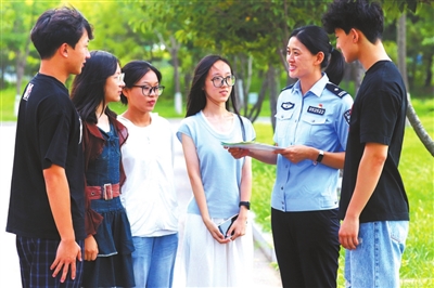 近日,在山東省高密市,2025級(jí)大學(xué)新生在聽當(dāng)?shù)毓簿址丛p中心民警講解反詐知識(shí)。李海濤 攝