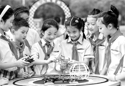 9月8日,江蘇省海安市城南實驗小學(xué)學(xué)生在了解無人機性能。近年來,該校將無人機、機器人等科技創(chuàng)新元素融入學(xué)校第二課堂,培養(yǎng)學(xué)生對科學(xué)技術(shù)的興趣和愛好,零距離感受科技魅力。