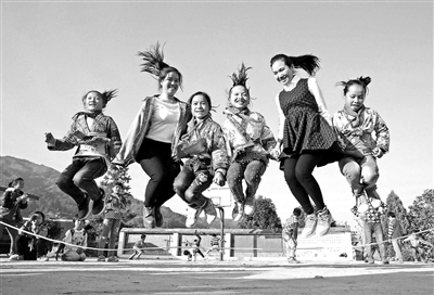 廣西柳州市融水苗族自治縣特崗教師與學(xué)生一起跳繩。 本報(bào)記者 張勁松 攝 (資料圖片)