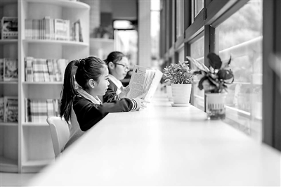 ①浙江省杭州江南實驗學校的學生在走廊讀書吧讀書。