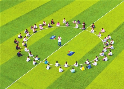 9月12日,在江蘇省揚(yáng)州市江都區(qū)第二中學(xué),醫(yī)護(hù)人員為學(xué)生講解急救知識(shí)(無(wú)人機(jī)照片)。