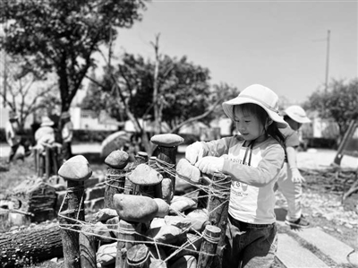 孩子運(yùn)用各種輔助材料搭建“鳥巢”。姚雯文 供圖