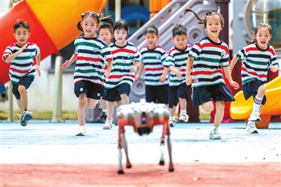 近日,浙江省湖州市長(zhǎng)興縣龍山幼兒園的孩子們與機(jī)器狗進(jìn)行跑步比賽。該園為孩子們講解機(jī)器狗和無人機(jī)等設(shè)備的相關(guān)知識(shí),讓孩子們零距離感受科技魅力。 譚云俸 攝
