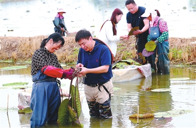 在江蘇省淮安市金湖縣呂良鎮(zhèn)的芡實(shí)種植基地,江蘇大學(xué)食品與生物工程學(xué)院教授崔鳳杰(前左二)與基地工作人員一起調(diào)研芡實(shí)移植情況。