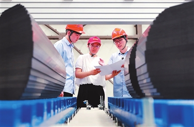 在江蘇大全集團(tuán)油浸式變壓器總裝車間,江蘇大學(xué)機(jī)械工程學(xué)院教授黃娟(中)現(xiàn)場解答企業(yè)生產(chǎn)中遇到的設(shè)計(jì)圖紙規(guī)范性問題。