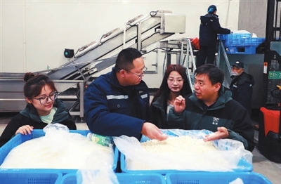 在江蘇蘇芡農(nóng)業(yè)產(chǎn)業(yè)發(fā)展有限公司冷鏈加工車間,崔鳳杰教授(前右一)帶領(lǐng)師生調(diào)研芡實(shí)加工情況。