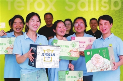 在江蘇蘇芡農(nóng)業(yè)產(chǎn)業(yè)發(fā)展有限公司,女工們展示公司開發(fā)的芡實(shí)系列產(chǎn)品。