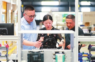 在江蘇大全集團(tuán)低壓成套電氣生產(chǎn)車間,江蘇大學(xué)計(jì)算機(jī)科學(xué)與通信工程學(xué)院教師宋雪樺(中)、金華(右)與企業(yè)技術(shù)人員交流基于AI的自動化生產(chǎn)線檢測技術(shù)。
