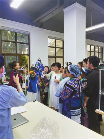 張順愛(ài)為研培班學(xué)員講解結(jié)對(duì)設(shè)計(jì)作品。 東華大學(xué)供圖